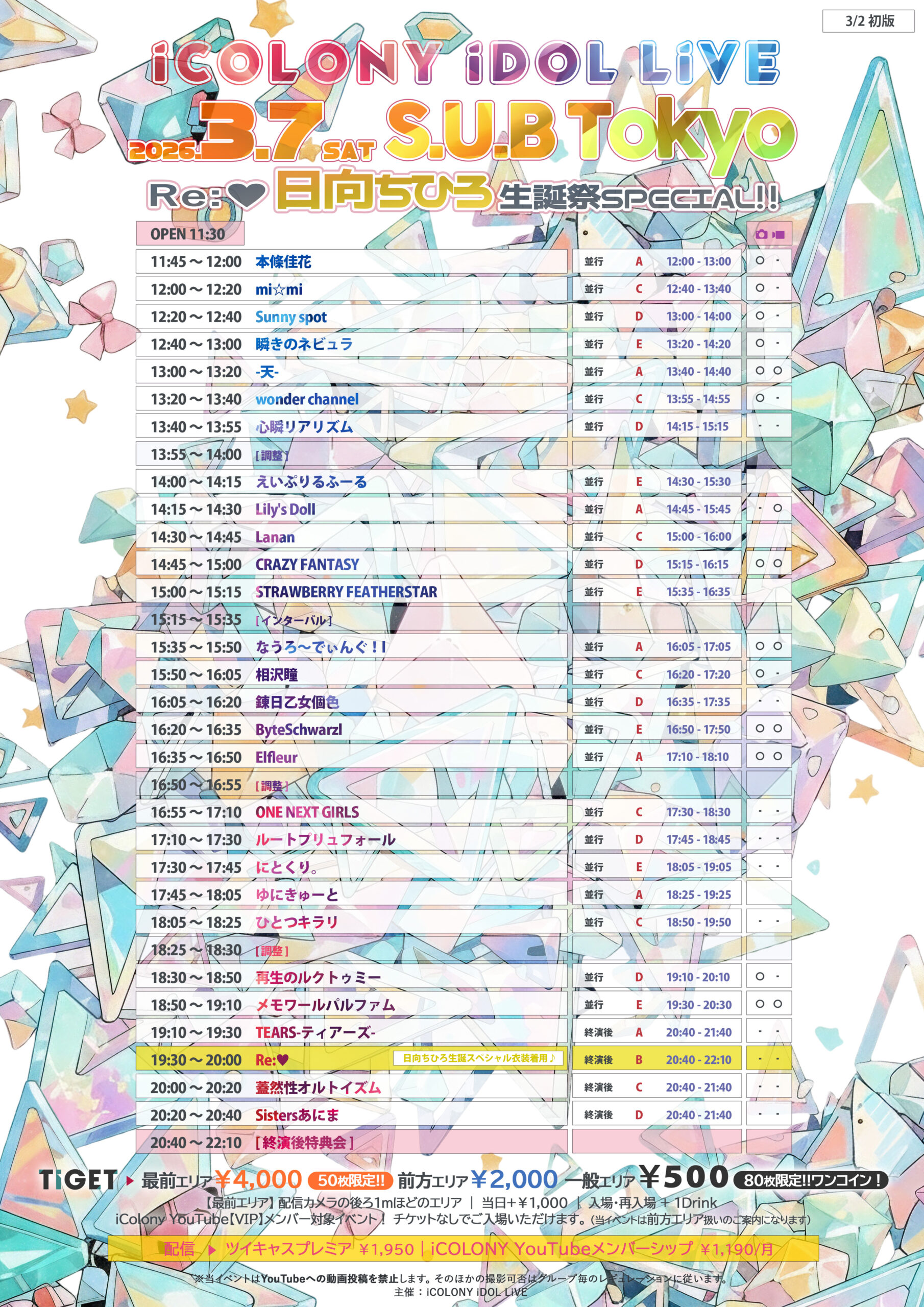 最前エリア¥4,000 前方エリア¥2,500 一般エリア¥500 当日+¥1,000