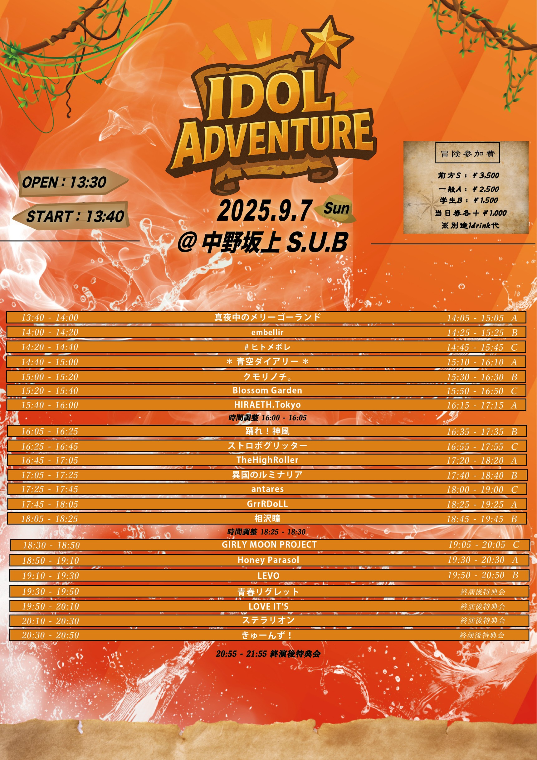 ストロボグリッター/LOVE IT’S/踊れ!神風/Honey Parasol/HIRAETH.Tokyo/クモリノチ。/ステラリオン/Rea Lis/真夜中のメリーゴーランド/TheHighRoller/#ヒトメボレ/* 青空ダイアリー */青春リグレット/LEVO/異国のルミナリア/embellir/Blossom Garden/きゅーんず!/GIRLY MOON PROJECT/相沢瞳/antares